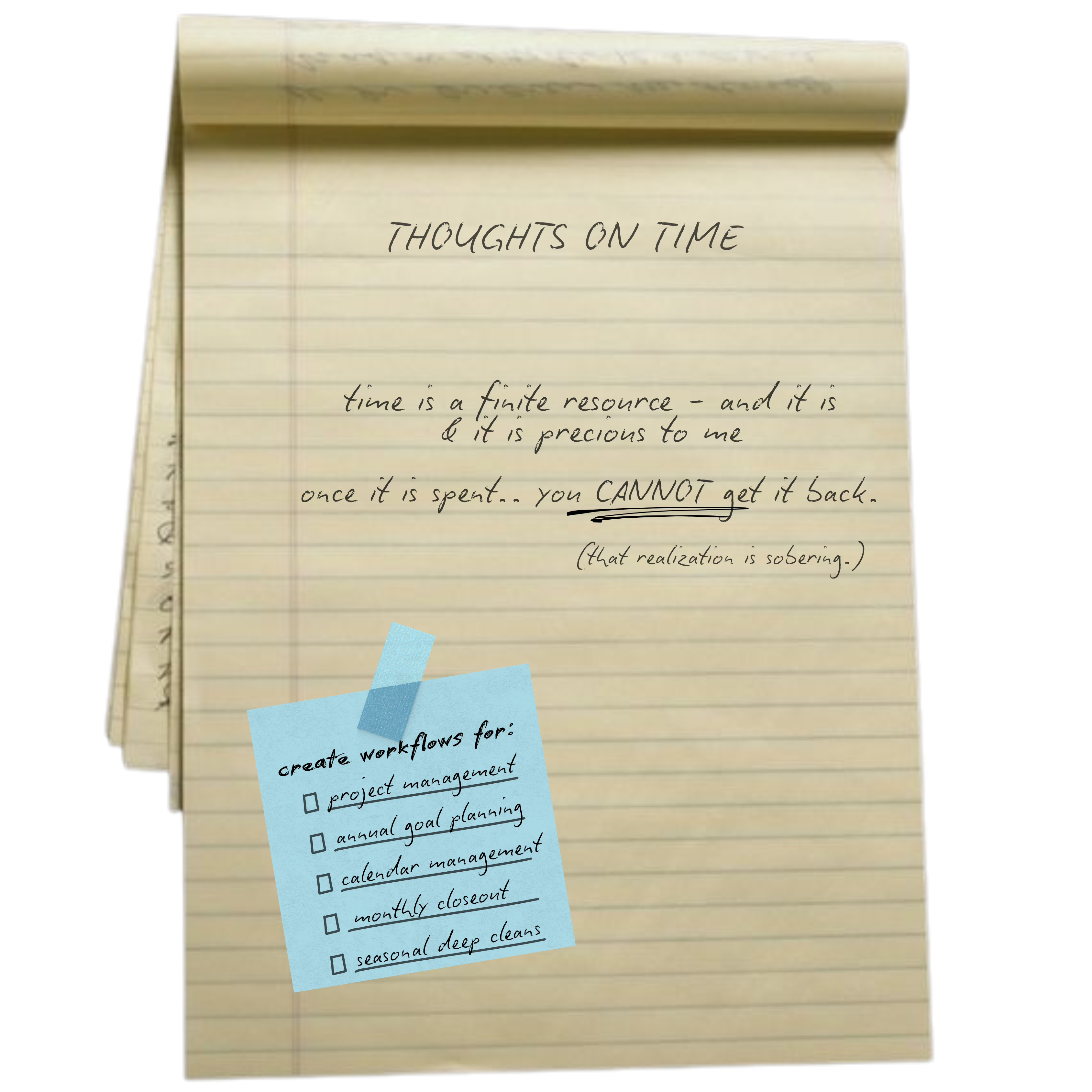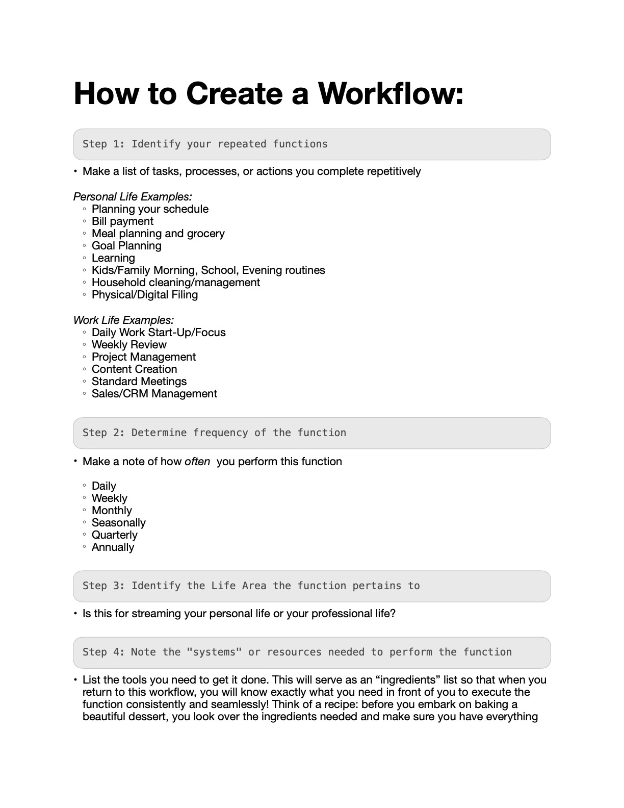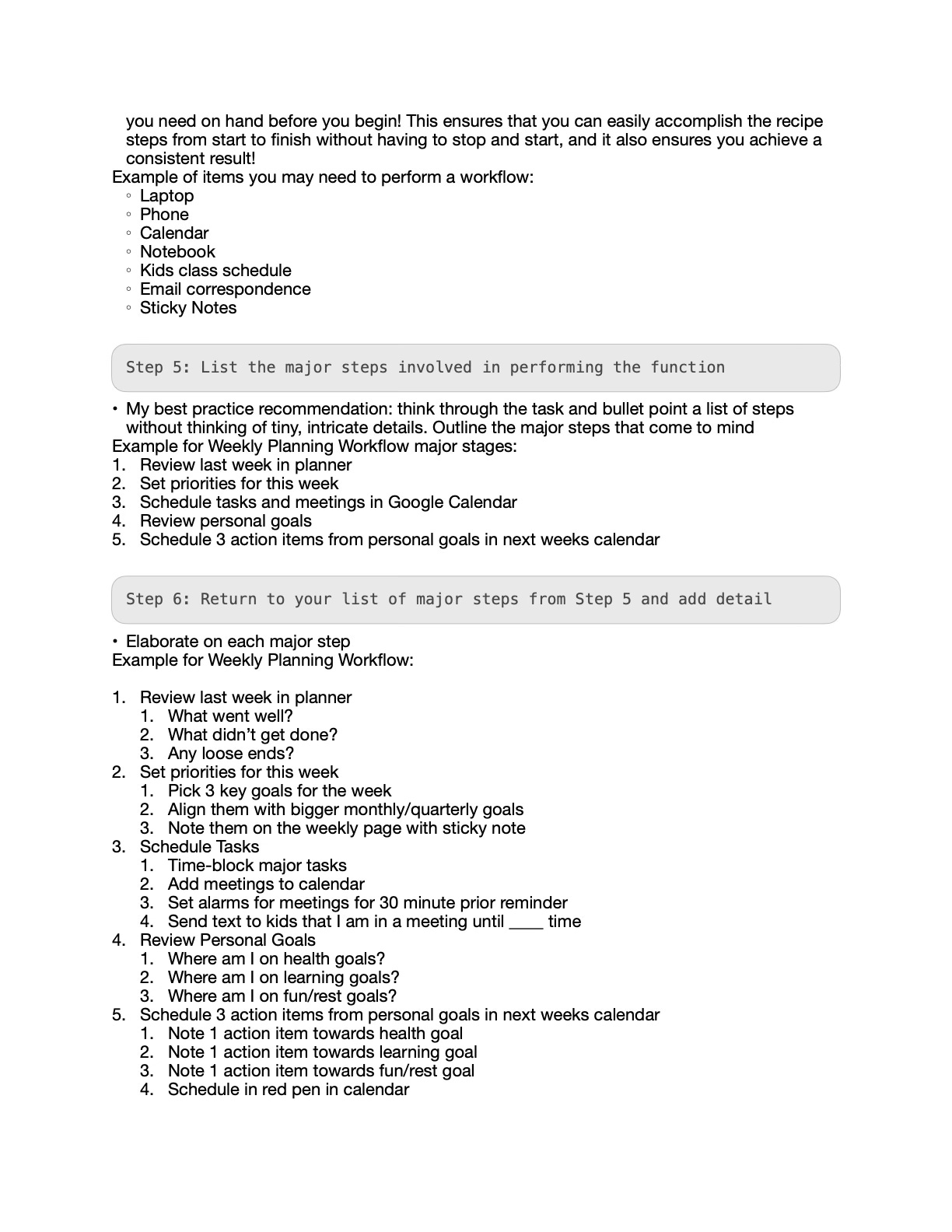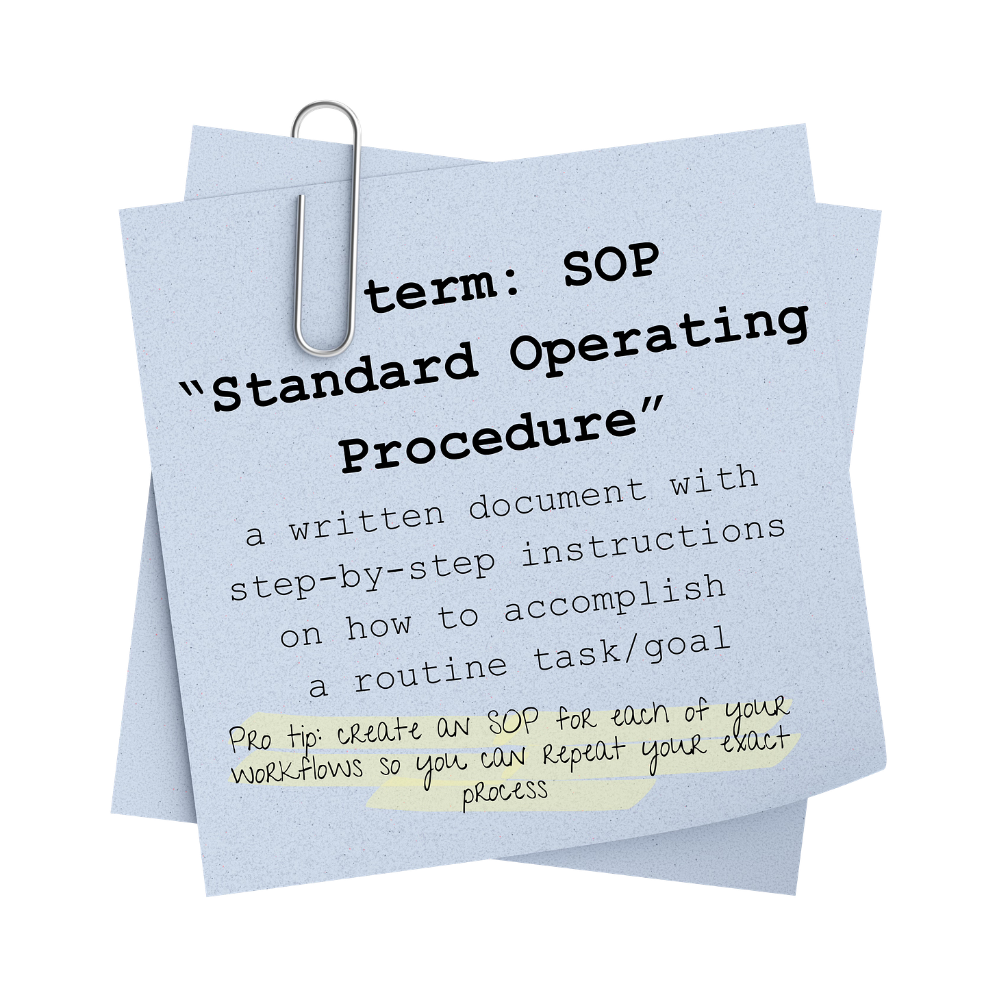 Once I have determined the best way to complete a function, I create a written SOP to save so that I am able to quickly reference it any time I repeat the same function. This takes the thinking-power out of having to remember exactly what I did before, and how to execute it with consistency. Remember, optimizing my time is my core objective - so creating an SOP to reference ensures that I am removing the “clunkiness” out of the process by knowing exactly what I need, and how to get it done right every time.