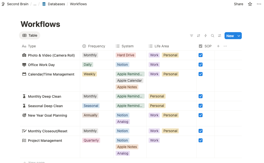 My preferred archive to store all of my workflow SOP’s is Notion. I have created a database that I can quickly link and relate to other relevant databases and pages within my workspace so that I can access the information easily and create fluid automations to make the best use of my work.
